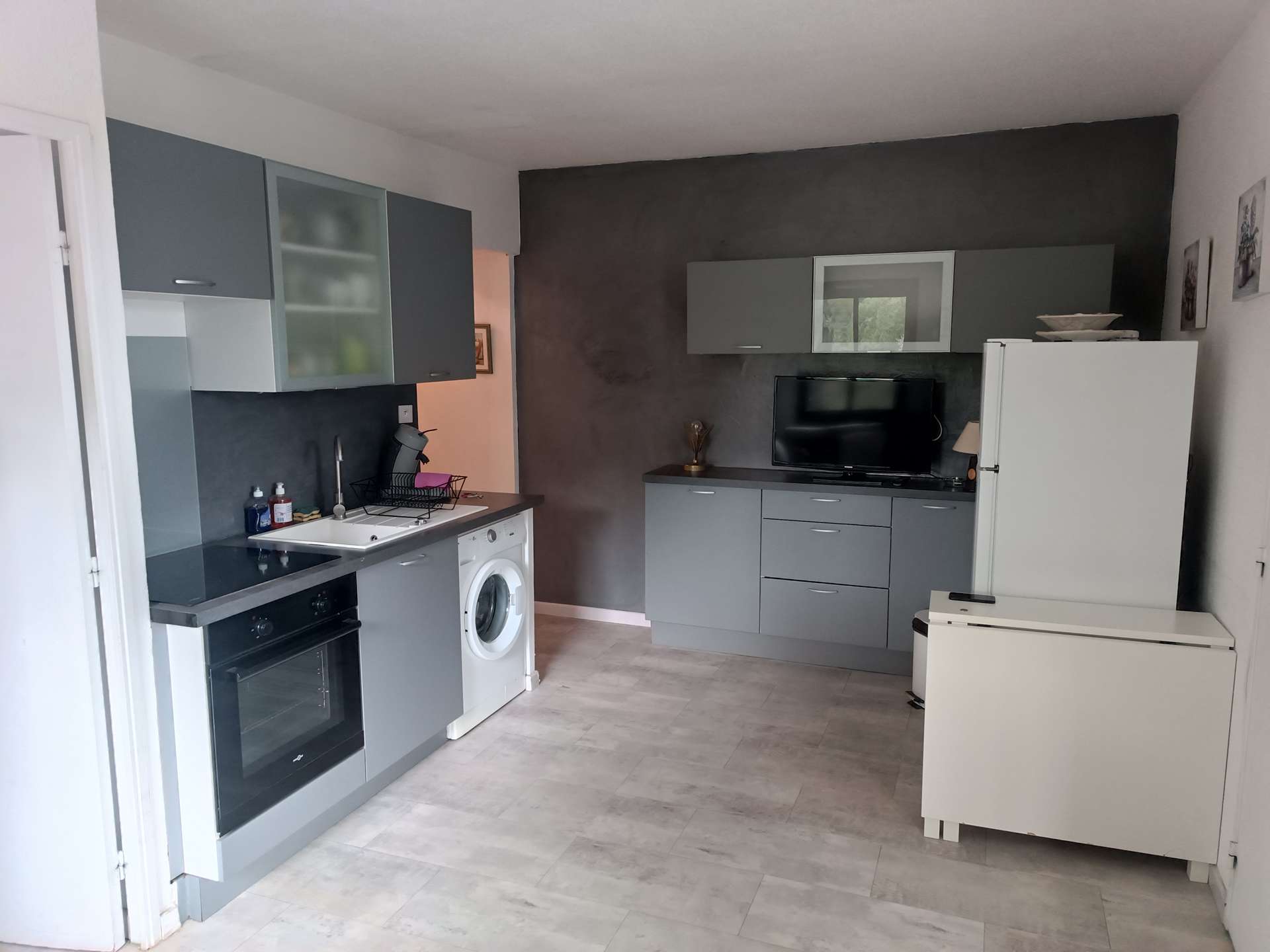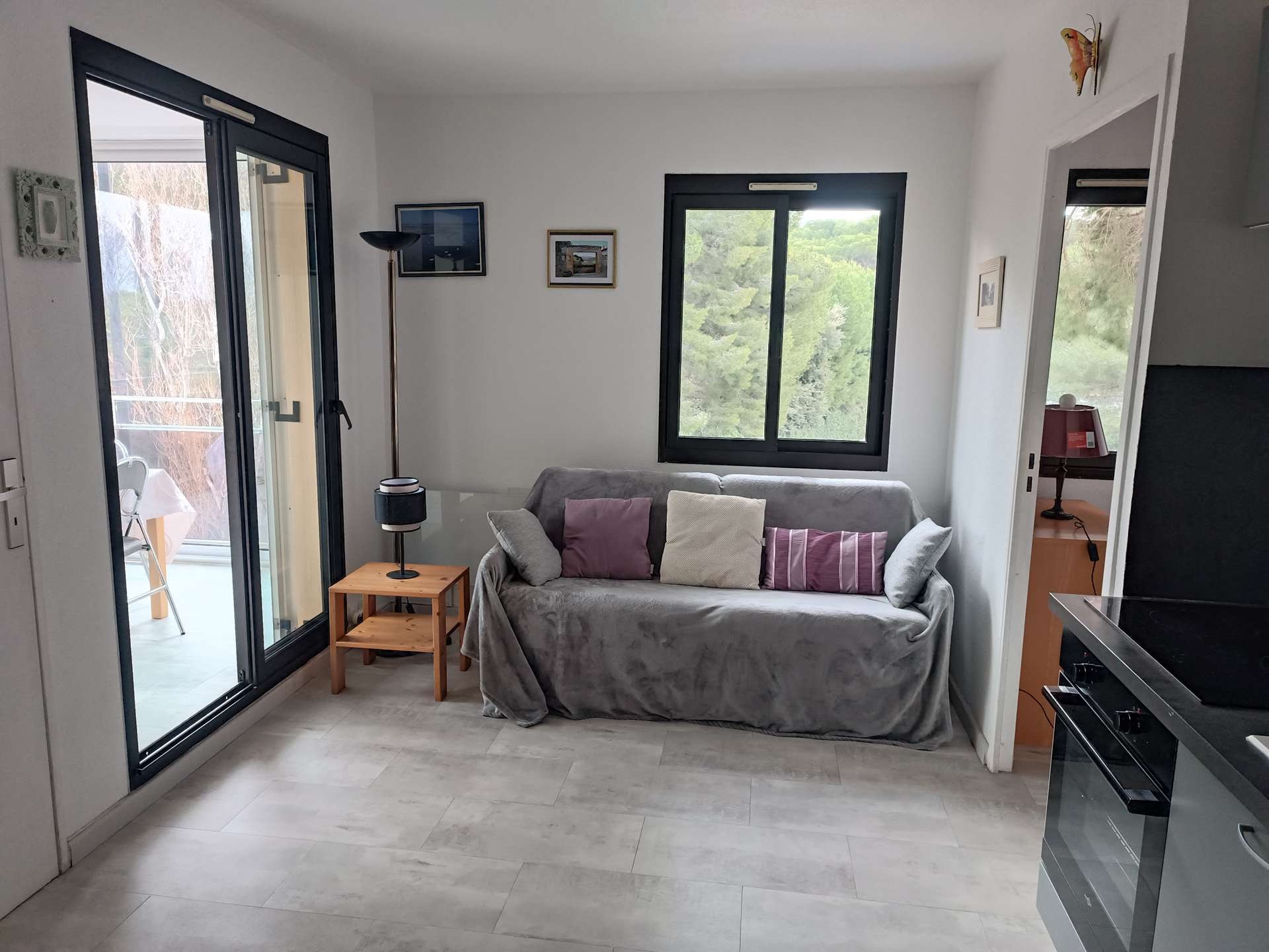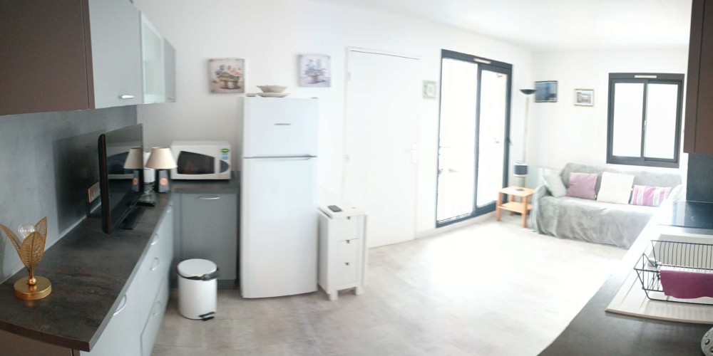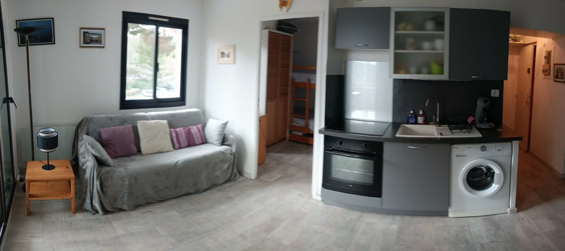 – séjour avec un canapé lit double ainsi qu’une cuisine ouverte et équipée