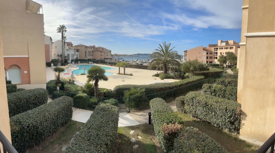 Cocktail des îles, joli T2 climatisé avec vue sur piscine et mer dans le domaine de la Coudoulière