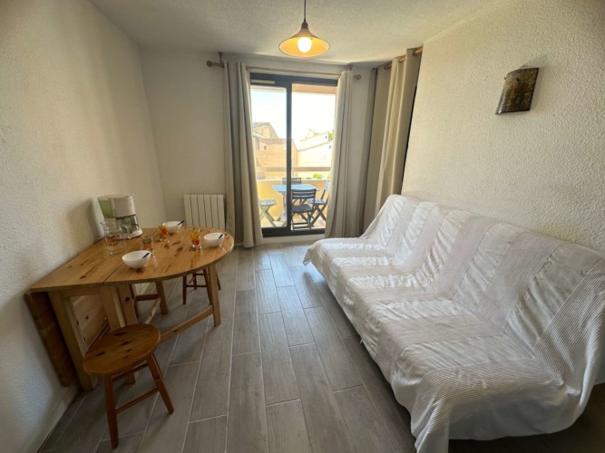 1 Séjour salle à manger avec un canapé lit convertible donnant sur un balcon