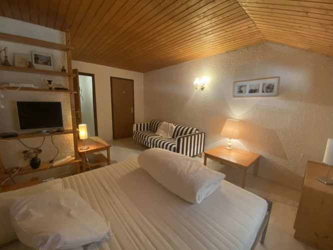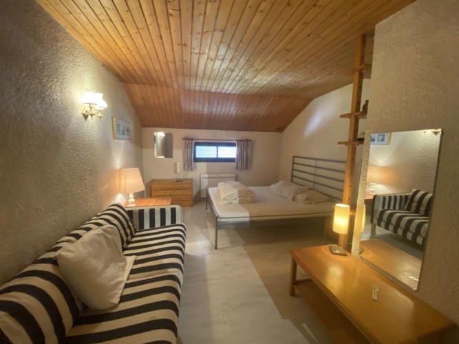 A l’étage, un second coin-montagne avec également deux lots simples superposés, une grande chambre confortable avec canapé et lit double, et une salle d’eau avec WC complètent l’espace.