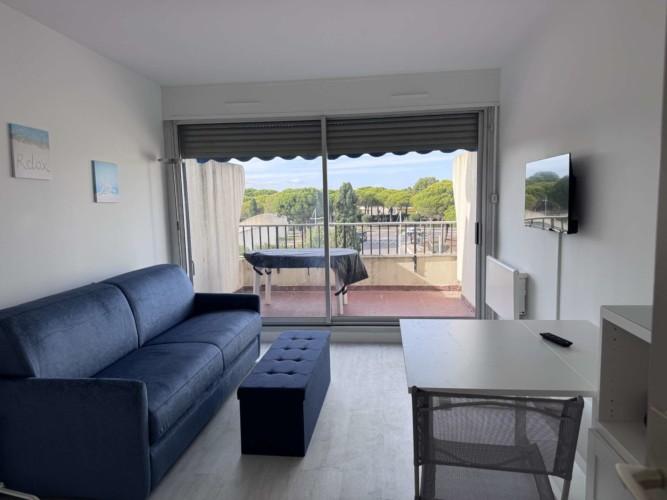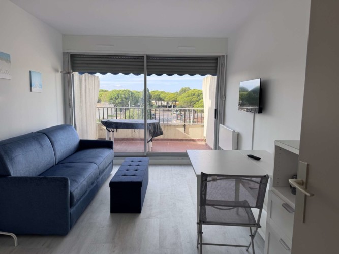 Situé au 3ème et dernier étage de la résidence Les Jardins du Port, nous vous proposons ce charmant appartement de 23m². Il se compose d un coin cuisine ouvert sur une grande pièce à vivre et une une salle d eau.. Avec son canapé convertible et ses 2 lits simples depliables, sa capacité de couchage est de 4 personnes . Vous pourrez profiter de son grand balcon avec vue sur les jardins et les courts de tennis de Port Camargue. Vous bénéficierez d une place de parking et de la piscine de la résidence dès le mois de juin. Venez passer d agréables vacances au Grau du Roi et vous découvrir notre belle région.