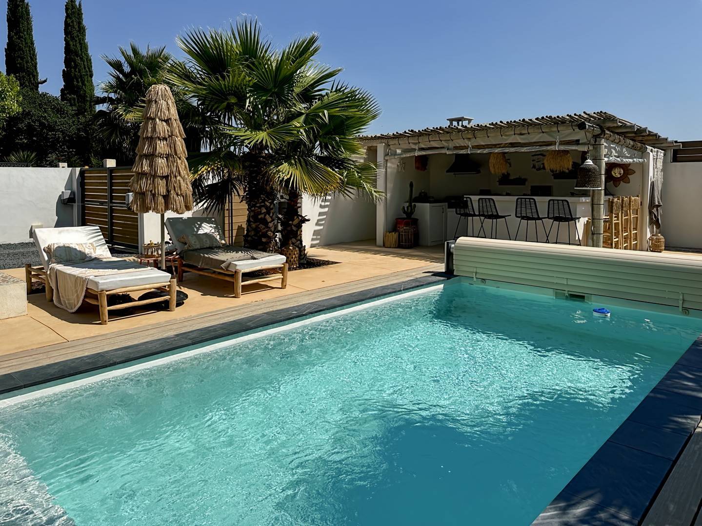 ituée à Saint Laurent d Aigouze en pleine campagne, nous vous proposons cette superbe villa contemporaine pour 4 personnes. Décorée avec goût, elle offre un confort particulier. Sa grande cuisine ouverte sur le salon avec une vue sur la piscine et le jardin, lui confère une atmosphère cosy et chaleureuse. A l étage, vous trouverez 2 chambres d enfants avec une salle de bain. Exposée plein sud, vous profiterez du soleil au quotidien et de la piscine à volonté. Venez passer des vacances de rêves dans cet endroit magique .